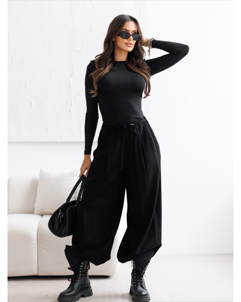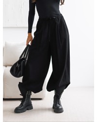 Wygodne spodnie o wyjątkowo szerokiej nogawce, stworzone z myślą o kobietach ceniących swobodę oraz modny, minimalistyczny wygląd. Elastyczna talia z regulacją na troczek zapewnia idealne dopasowanie, a lekki, miękko układający się materiał gwarantuje komfort przez cały dzień. Nogawki wykończone ściągaczem subtelnie podkreślają efekt nowoczesnego, nonszalanckiego fasonu.