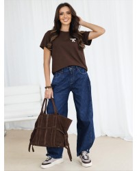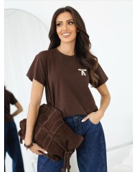 Największą uwagę przyciąga delikatna ozdoba przy dekolcie w formie małej kokardki z dekoracyjną tasiemką. Ten drobny detal nadaje koszulce oryginalności i minimalistycznego uroku, jednocześnie nie dominując całej stylizacji.