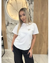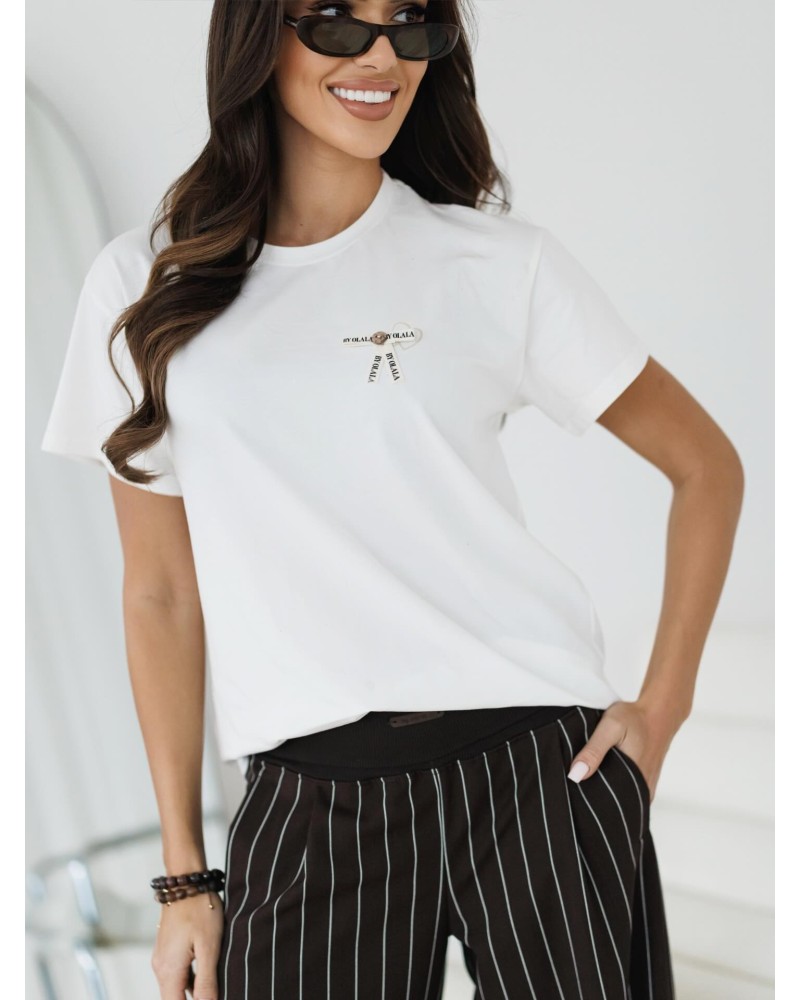 Klasyczny t-shirt z delikatną ozdobą przy dekolcie. Wygodny, miękki i idealny na co dzień — dostępny w kilku uniwersalnych kolorach.