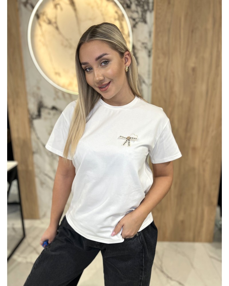 T-shirt z logowaną kokardką By o la la..! śmietankowy