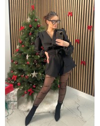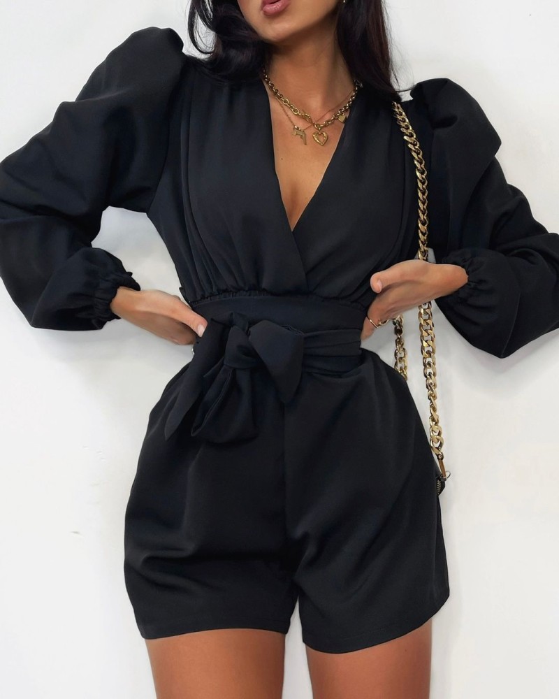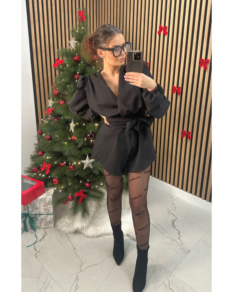 Elegancki kombinezon z głębokim dekoltem, bufiastymi rękawami i efektownym wiązaniem w talii. Zmysłowy, kobiecy i idealny na wyjątkowe okazje.