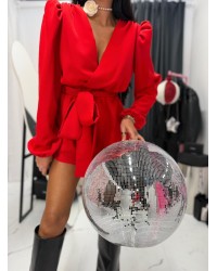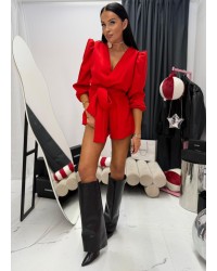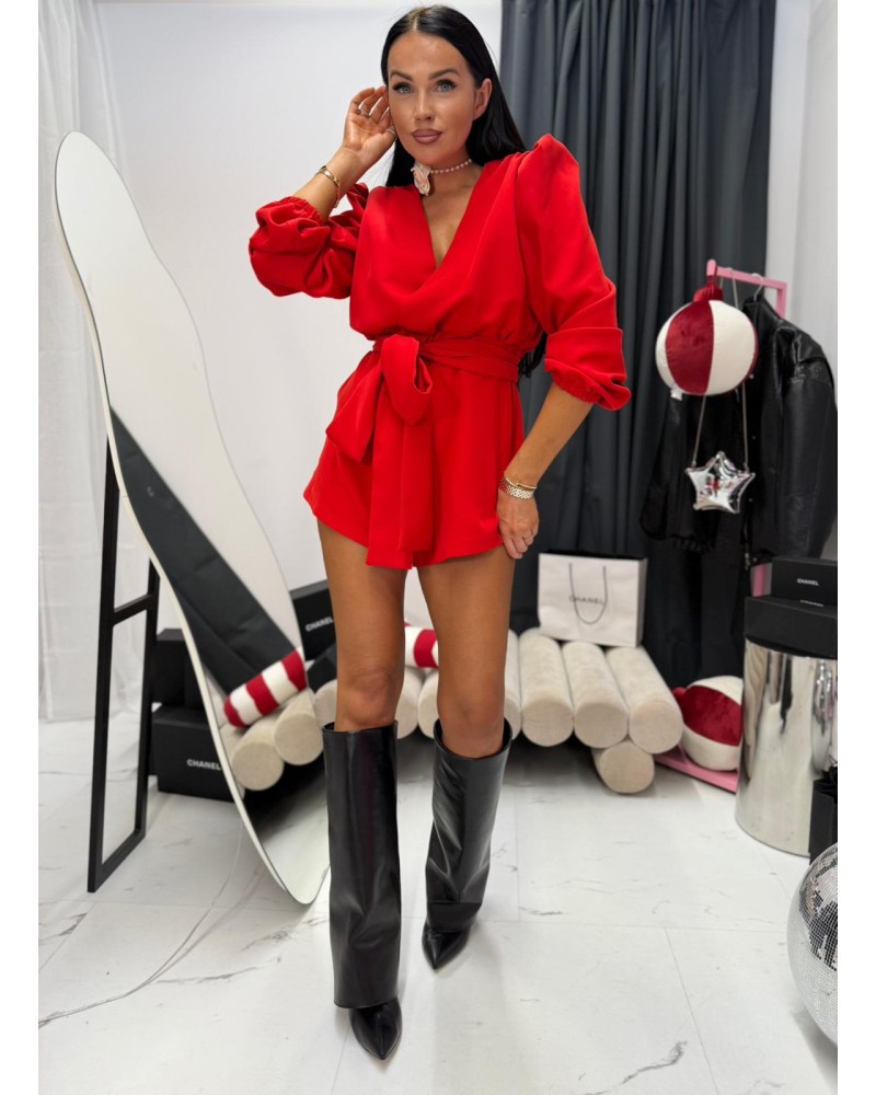 Elegancki kombinezon z głębokim dekoltem, bufiastymi rękawami i efektownym wiązaniem w talii. Zmysłowy, kobiecy i idealny na wyjątkowe okazje.