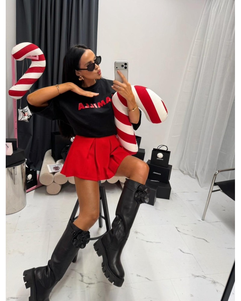 Czarny t-shirt oversize z wyrazistym czerwonym napisem „LAMILLA”. Modny, wygodny i idealny do codziennych, streetwearowych stylizacji.