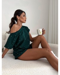 Spodenki posiadają elastyczną gumkę w pasie oraz funkcjonalne kieszenie, dzięki którym dobrze układają się na sylwetce i pozostają wygodne nawet podczas dłuższego noszenia. Całość zdobi drobny wzór gwiazdek, który nadaje piżamie wyjątkowego, sezonowego wyrazu, jednocześnie zachowując subtelność.