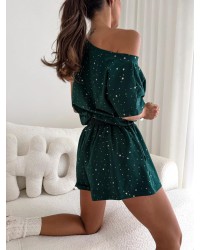 Miękka dwuczęściowa piżama z luźną górą i wygodnymi spodenkami z kieszeniami, zdobiona subtelnym wzorem gwiazdek. Idealna na spokojne noce i przytulne poranki.
