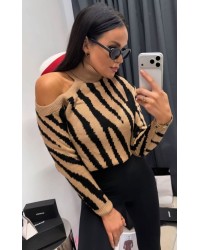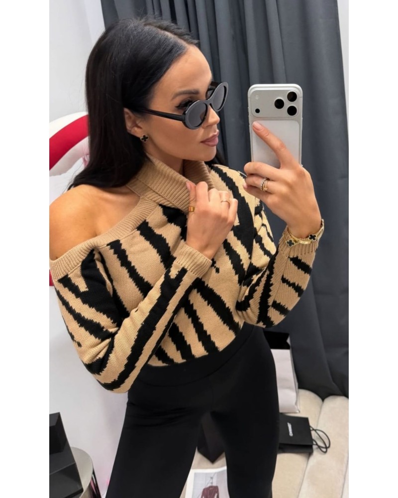 Stylowy beżowo-czarny sweter z odsłoniętym ramieniem i szerokim kołnierzem. Miękki, modny i idealny do jesienno-zimowych stylizacji.