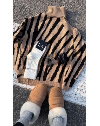 Beżowo-czarny wzór w dynamiczne, geometryczne pasy sprawia, że sweter przyciąga uwagę i świetnie komponuje się z jednolitymi, dopasowanymi dołami. Wykonany z miękkiej, przyjemnej w dotyku dzianiny, zapewnia komfort noszenia i idealnie sprawdzi się w chłodniejsze dni.