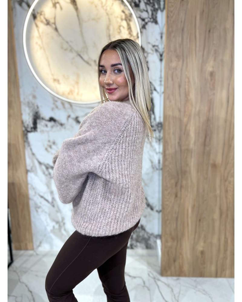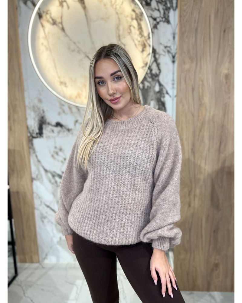 Miękki, puszysty sweter o luźnym kroju i delikatnym, włochatym wykończeniu. Niezwykle przyjemny w dotyku, ciepły i kobiecy — idealny na chłodne dni.