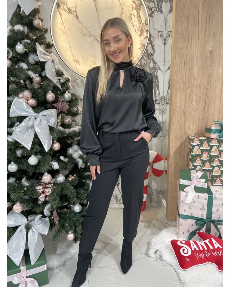 Eleganckie spodnie z prostą nogawką i subtelną aplikacją w pasie. Wykonane z komfortowego materiału, zapewniają idealne dopasowanie i wygodę na co dzień oraz w stylizacjach bardziej formalnych.