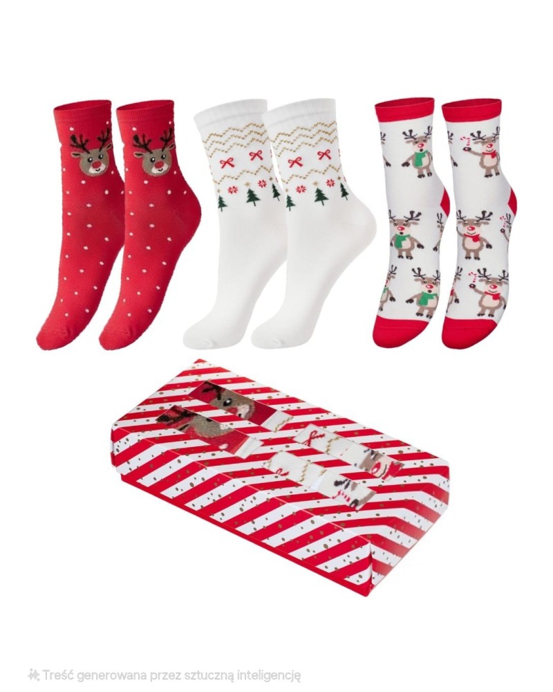 Zestaw świąteczny damski to 3 pary skarpetek świątecznych damskich. Oczywiście specjalnie dla Was zapakowaliśmy je w estetyczne kartonowe pudełko z okienkiem. W zestawie znajdują się dwie pary skarpetek w wesoły, świąteczny wzór oraz jedna gładka z ozdobną złotą gwiazdką.