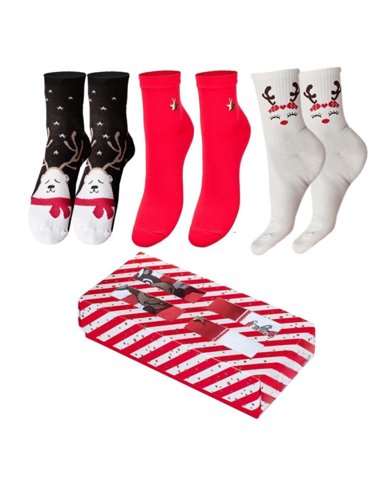 Zestaw świąteczny damski to 3 pary skarpetek świątecznych damskich. Oczywiście specjalnie dla Was zapakowaliśmy je w estetyczne kartonowe pudełko z okienkiem. W zestawie znajdują się dwie pary skarpetek w wesoły, świąteczny wzór oraz jedna gładka z ozdobną złotą gwiazdką.