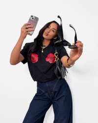 T-shirt damski z motywem róż to połączenie klasycznego fasonu z wyrazistym, kobiecym detalem. Model posiada prosty krój z okrągłym dekoltem, który zapewnia wygodę noszenia i swobodę ruchów przez cały dzień. Nadruk umieszczony na przodzie przyciąga uwagę i nadaje koszulce modowego charakteru, dzięki czemu całość prezentuje się nowocześnie i stylowo.
