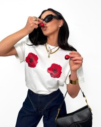 T-shirt damski z nadrukiem róż, wykonany z miękkiej bawełny. Klasyczny krój z okrągłym dekoltem, idealny do codziennych i miejskich stylizacji.
