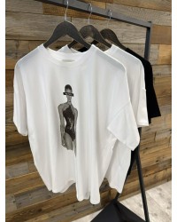 T-shirt oversize z minimalistycznym nadrukiem sylwetki modelki w body. Luźny krój, miękka bawełna i nowoczesny design w modnym wydaniu.