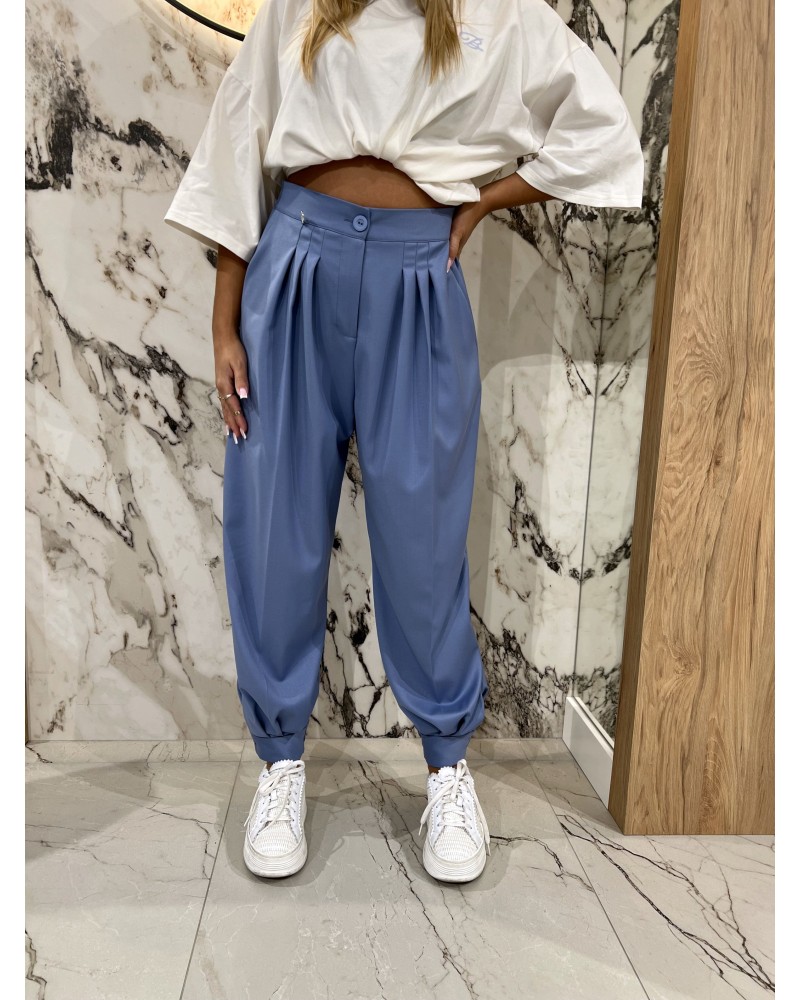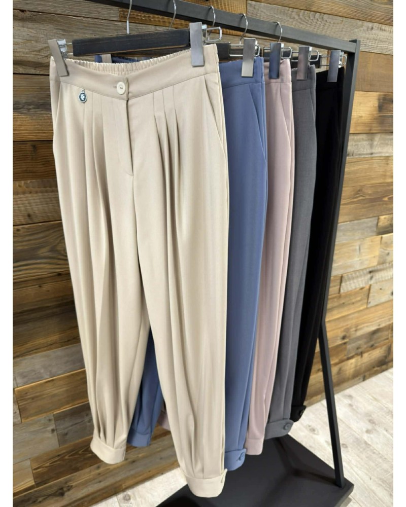 Model posiada klasyczne zakładki z przodu, które dodają elegancji i podkreślają talię. Z tyłu znajduje się elastyczna gumka w pasie, dzięki czemu spodnie idealnie dopasowują się do sylwetki i są bardzo wygodne w noszeniu. Nogawki są lekko zwężane i zakończone eleganckim mankietem z guzikiem, co nadaje całości nowoczesnego, dopracowanego charakteru.