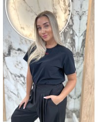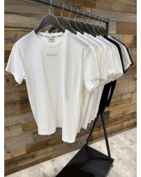 Na przodzie znajduje się subtelne, haftowane logo, które dodaje koszulce eleganckiego i minimalistycznego charakteru. Klasyczny krój z okrągłym dekoltem oraz krótkim rękawem sprawia, że T-shirt świetnie leży na sylwetce i pasuje do wielu zestawów — od casualowych po bardziej eleganckie