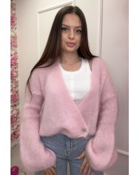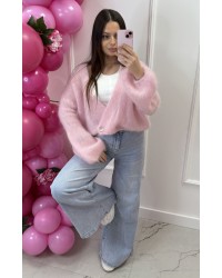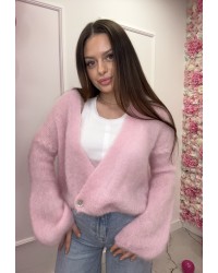 Krótki kardigan z perłowymi guzikami pudrowy róż