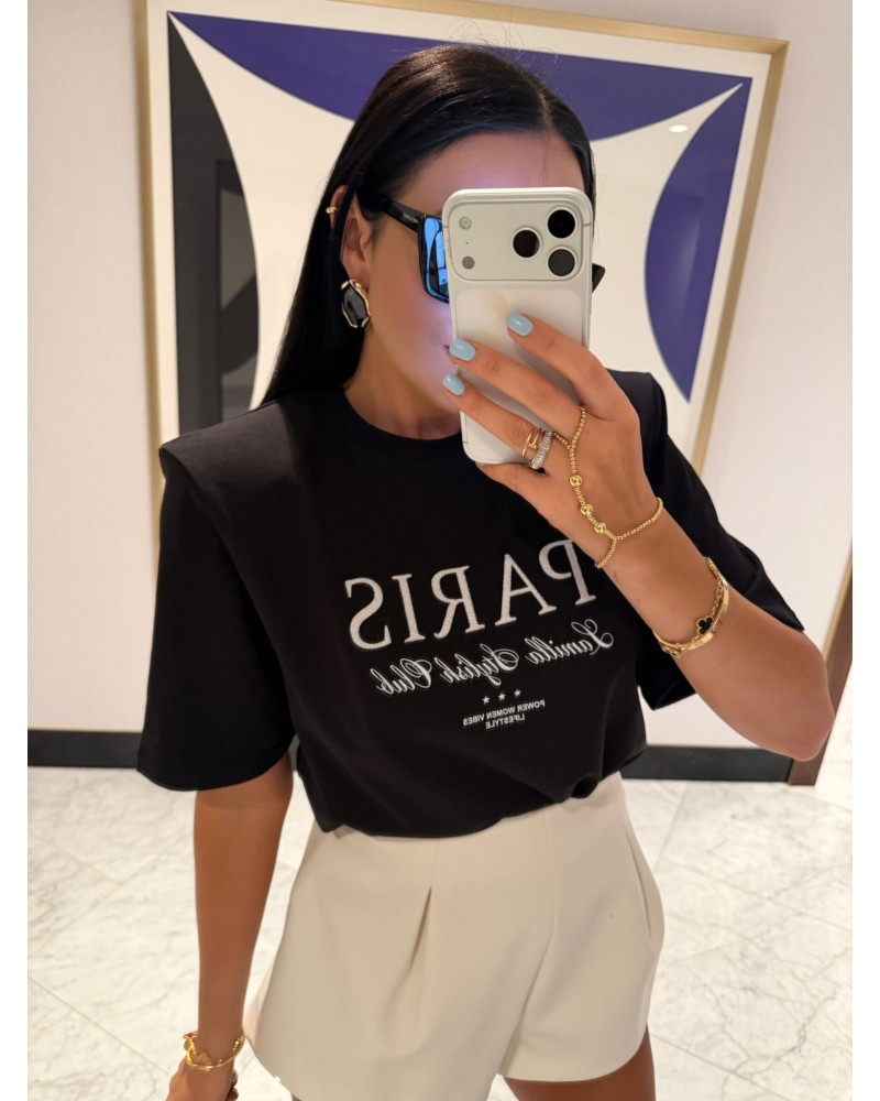 Klasyczny krój z delikatnie podwiniętymi rękawkami nadaje całości nowoczesnego luzu, a wyrazisty nadruk „PARIS – Lamilla Stylish Club” podkreśla modowy charakter koszulki. Minimalistyczna, a jednocześnie stylowa grafika sprawia, że T-shirt doskonale wpisuje się w aktualne trendy.