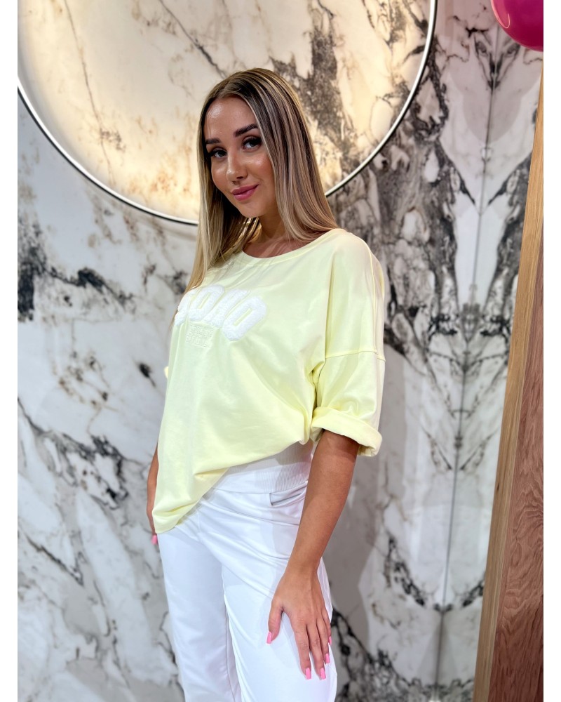 Oversizowy T-shirt z haftowanym napisem „SOHO”. Luźny krój, miękka bawełna i miejski styl na co dzień.
