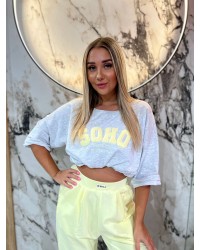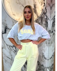 Oversizowy T-shirt z haftowanym napisem „SOHO”. Luźny krój, miękka bawełna i miejski styl na co dzień.