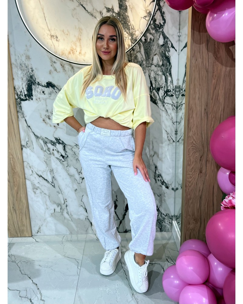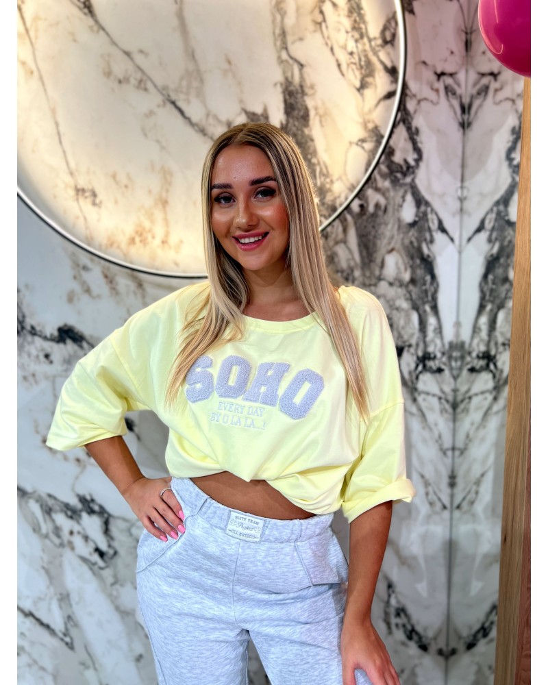 Oversizowy T-shirt z haftowanym napisem „SOHO”. Luźny krój, miękka bawełna i miejski styl na co dzień.