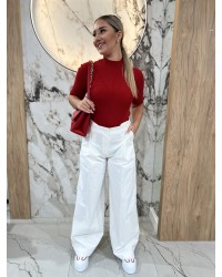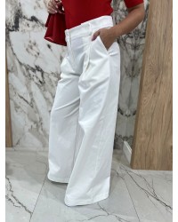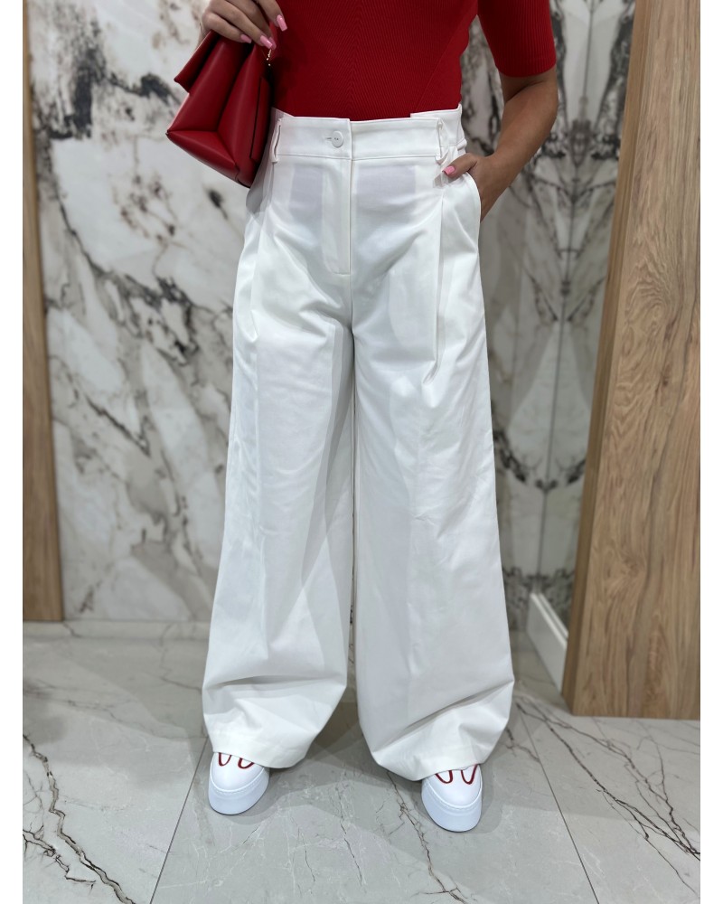 Stylowe spodnie o dopracowanym, eleganckim kroju, które pięknie modelują sylwetkę i podkreślają talię. Wysoki stan oraz szerokie, swobodnie opadające nogawki tworzą wydłużoną, harmonijną linię i nadają całości lekkości. Minimalistyczna forma została uzupełniona subtelnymi zakładkami oraz czystym wykończeniem, co sprawia, że model prezentuje się niezwykle szykownie i ponadczasowo.