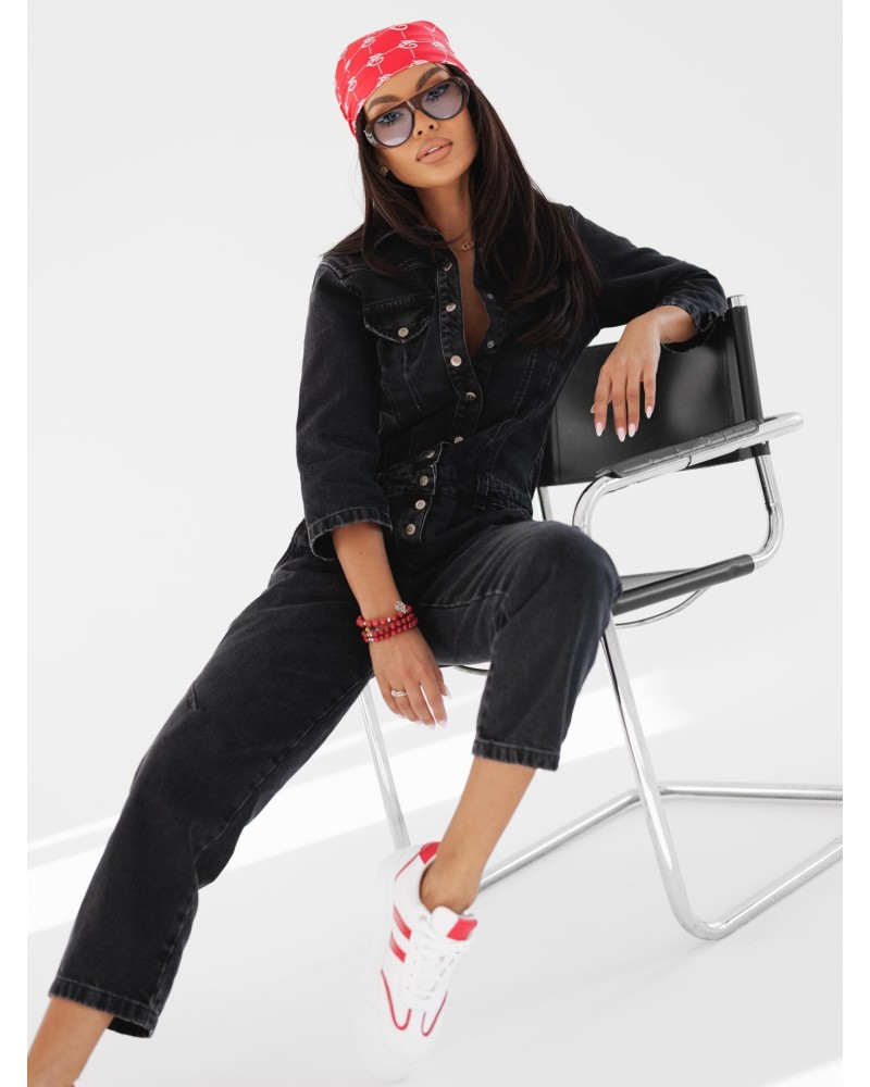 Stylowy kombinezon jeansowy o kobiecym, dopracowanym kroju, który podkreśla sylwetkę i nadaje stylizacji wyrazistego charakteru. Dopasowana góra z klasycznym kołnierzykiem i zapięciem na guziki nawiązuje do formy koszuli, a modelujące przeszycia podkreślają talię. Dół o swobodniejszym fasonie zapewnia komfort noszenia i nowoczesne proporcje.