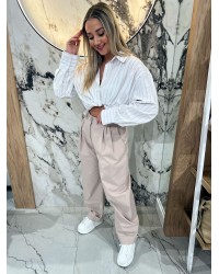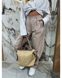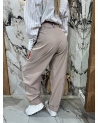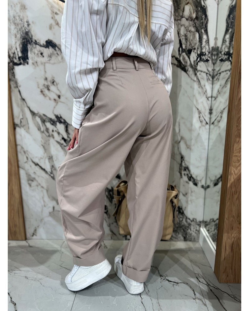Spodnie o wyrafinowanym fasonie, które przyciągają uwagę swoją formą. Model posiada zakładki z przodu, dzięki czemu pięknie układa się w ruchu i nadaje sylwetce lekkości. Luźniejsza nogawka zakończona mankietem tworzy modową, lekko balonową linię, podkreślając nowoczesny styl.