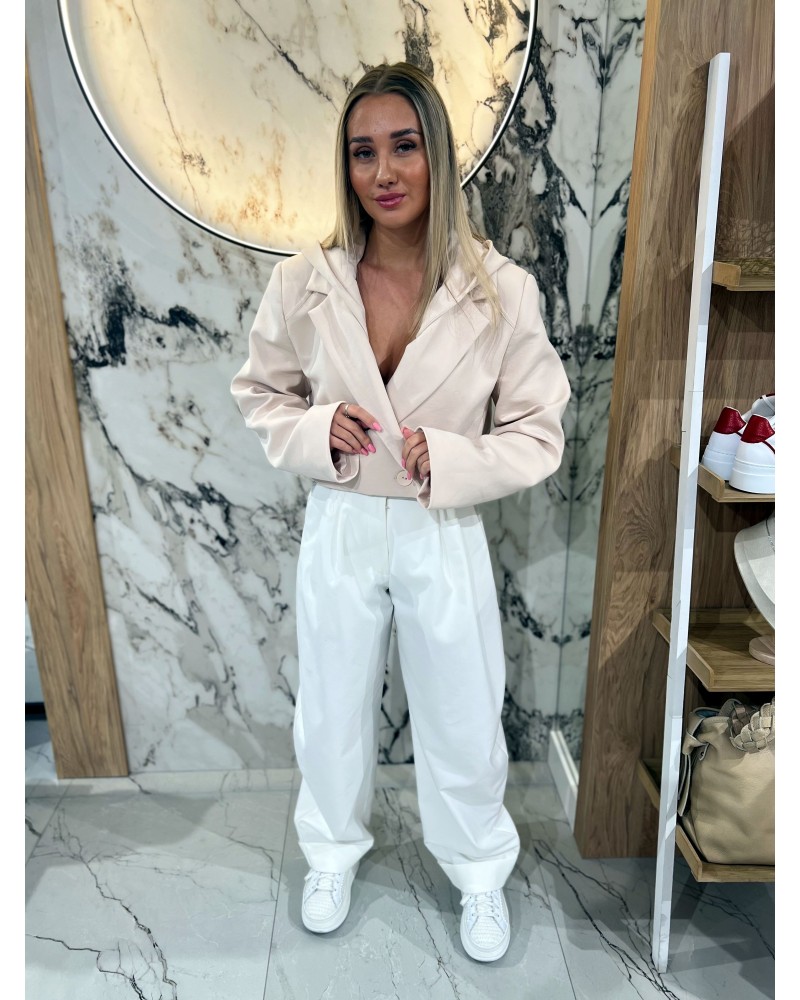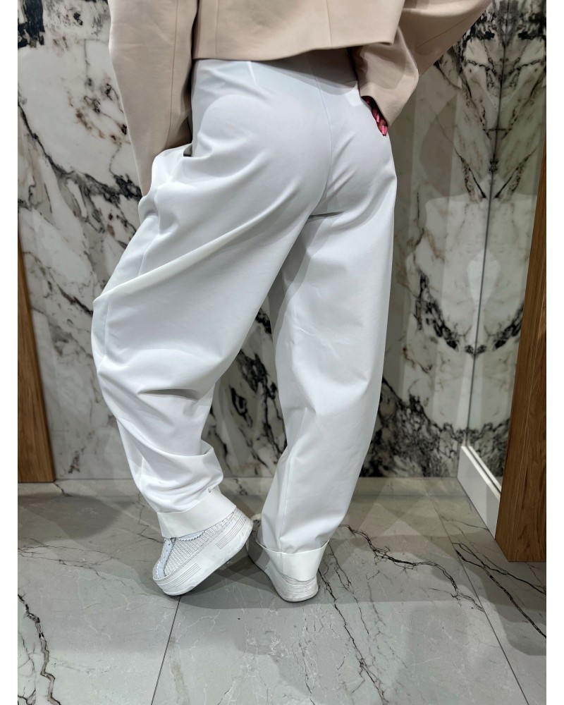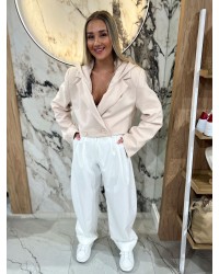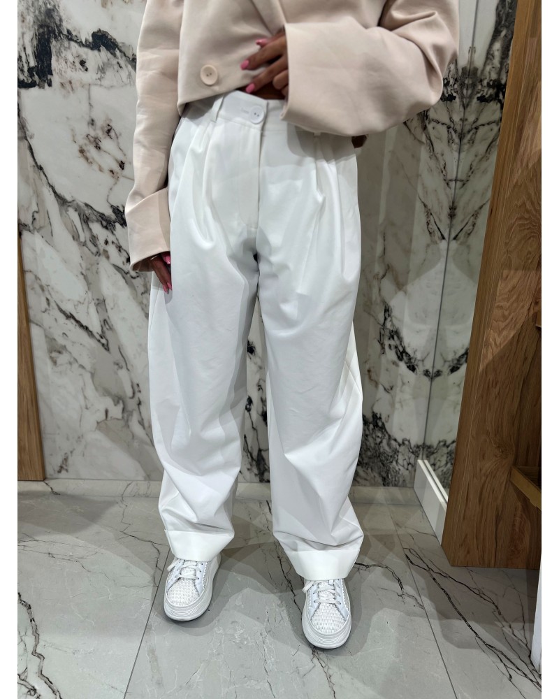 Spodnie o wyrafinowanym fasonie, które przyciągają uwagę swoją formą. Model posiada zakładki z przodu, dzięki czemu pięknie układa się w ruchu i nadaje sylwetce lekkości. Luźniejsza nogawka zakończona mankietem tworzy modową, lekko balonową linię, podkreślając nowoczesny styl.