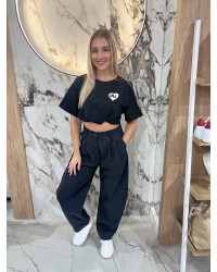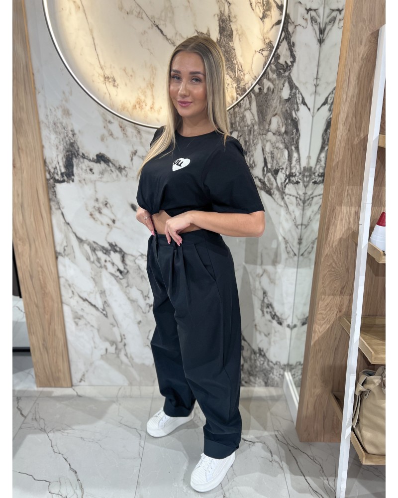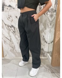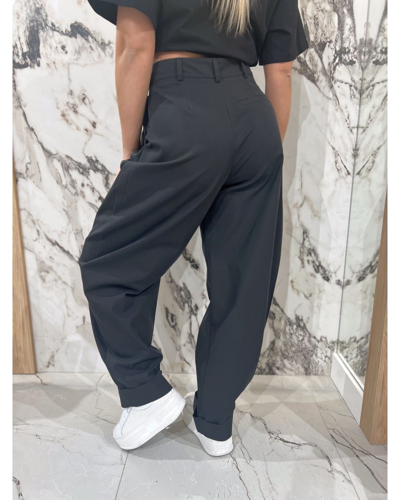 Spodnie o wyrafinowanym fasonie, które przyciągają uwagę swoją formą. Model posiada zakładki z przodu, dzięki czemu pięknie układa się w ruchu i nadaje sylwetce lekkości. Luźniejsza nogawka zakończona mankietem tworzy modową, lekko balonową linię, podkreślając nowoczesny styl.